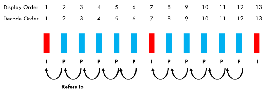 - Similar to P Frames but may also refer to future frames to be decoded. B stands for bi-directional