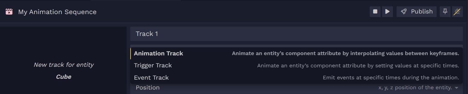 Trigger tracks are also used to animate an entity’s component attribute. Unlike animation tracks, a trigger track will not interpolate between keys, but will simply set the key value at the key time.