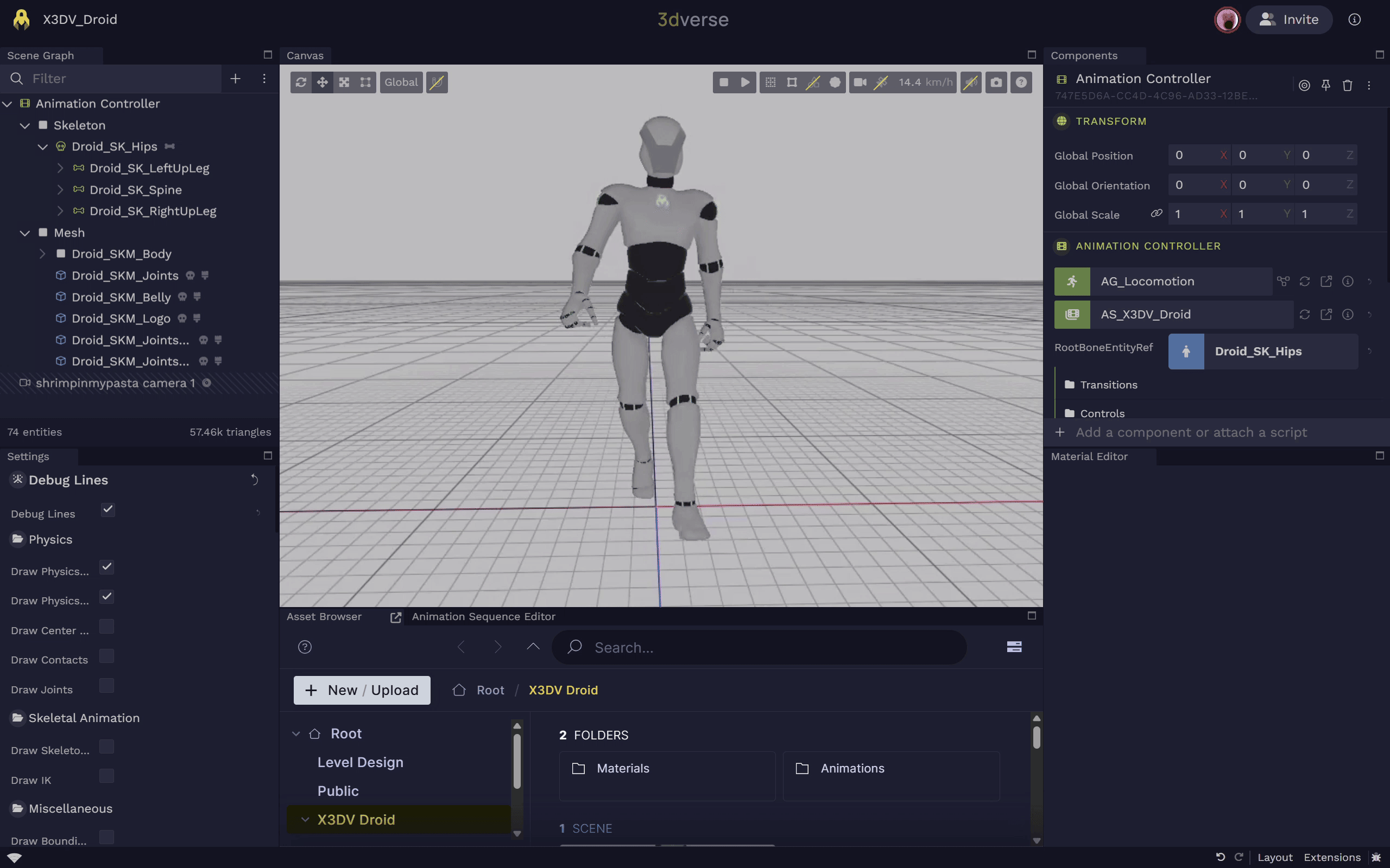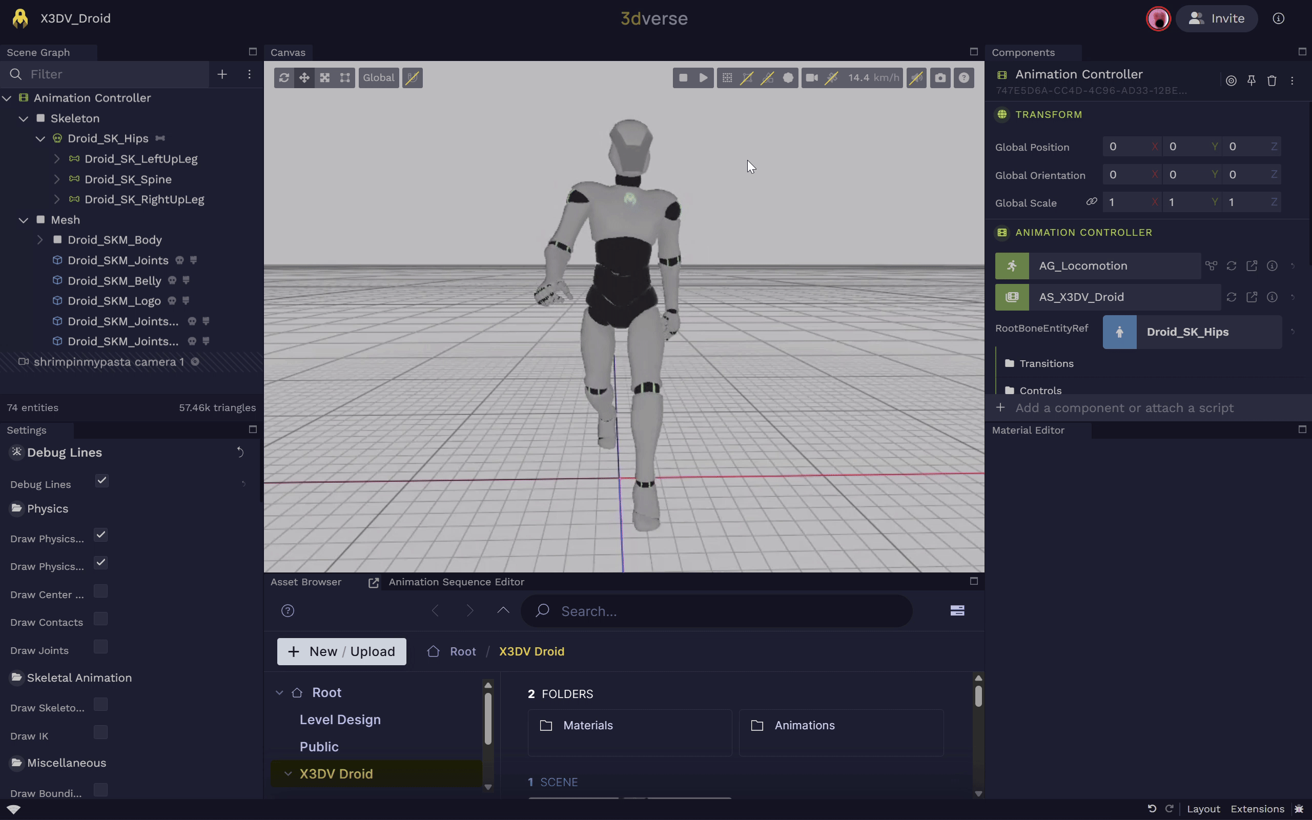 A default animation graph and animation set are automatically converted from a source files containing rigged models.