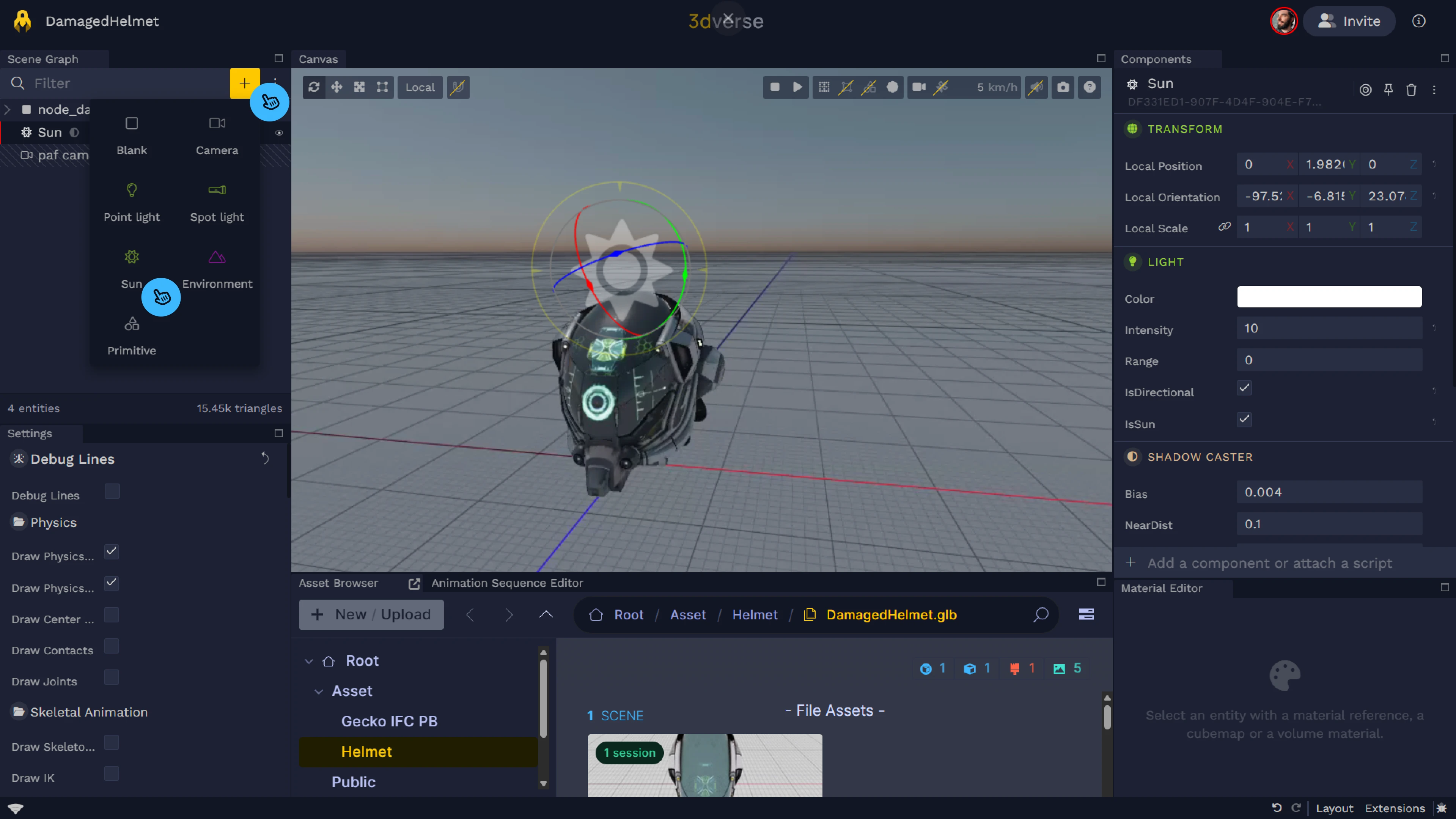 . A sun has a light component with isSun enabled. You can change the sun color and intensity. Play with its orientation and see how that changes the lighting and shadows of your scene.